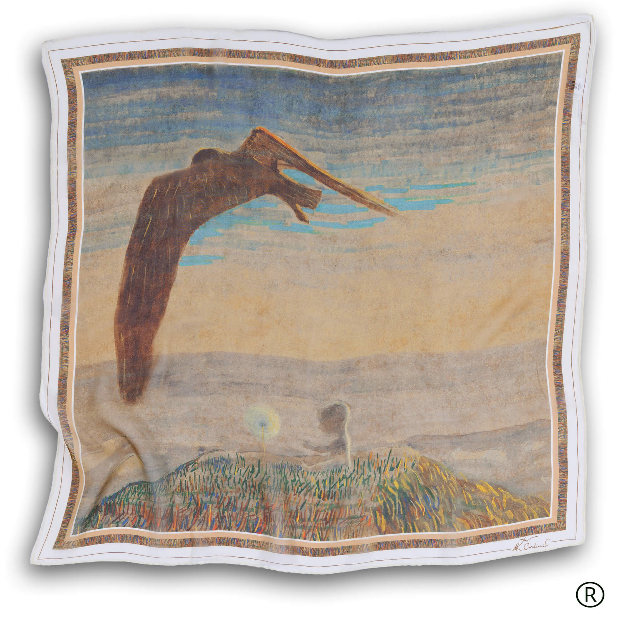 Originalaus, registruoto dizaino natūralaus šilko žoržeto (georgette) skarelė su M. K. Čiurlionio paveikslo „Pasaka. Karalaitės kelionė“ atvaizdu