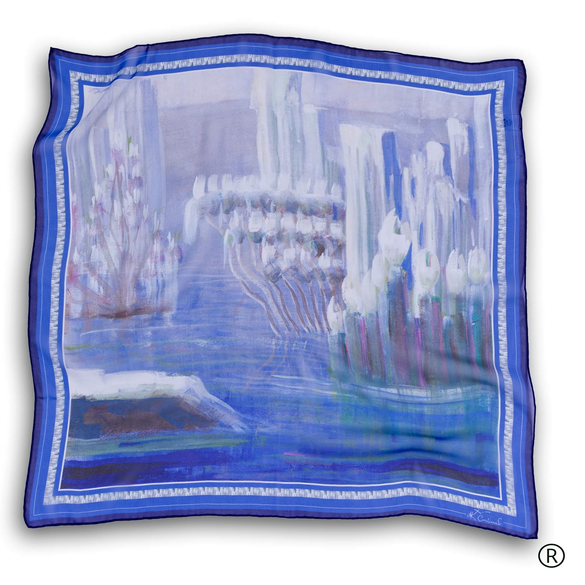 Originalaus, registruoto dizaino natūralaus šilko žoržeto (georgette) skarelė su M. K. Čiurlionio paveikslo „Pasaulio sutvėrimas VI“ atvaizdu.