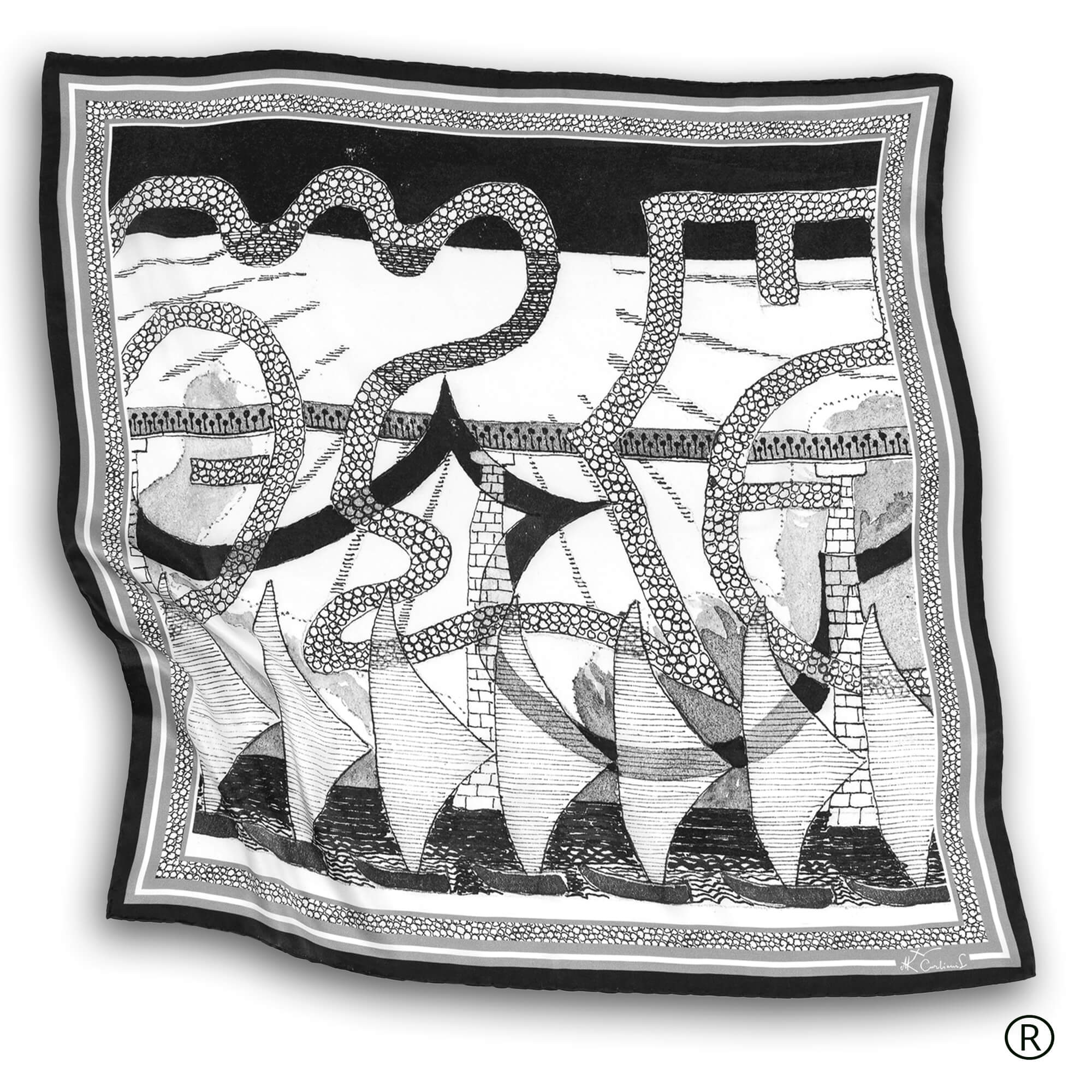 Originalaus, registruoto dizaino natūralaus šilko skarelė su M. K. Čiurlionio kūrinio, vinjetės „Laiveliai“ atvaizdu.