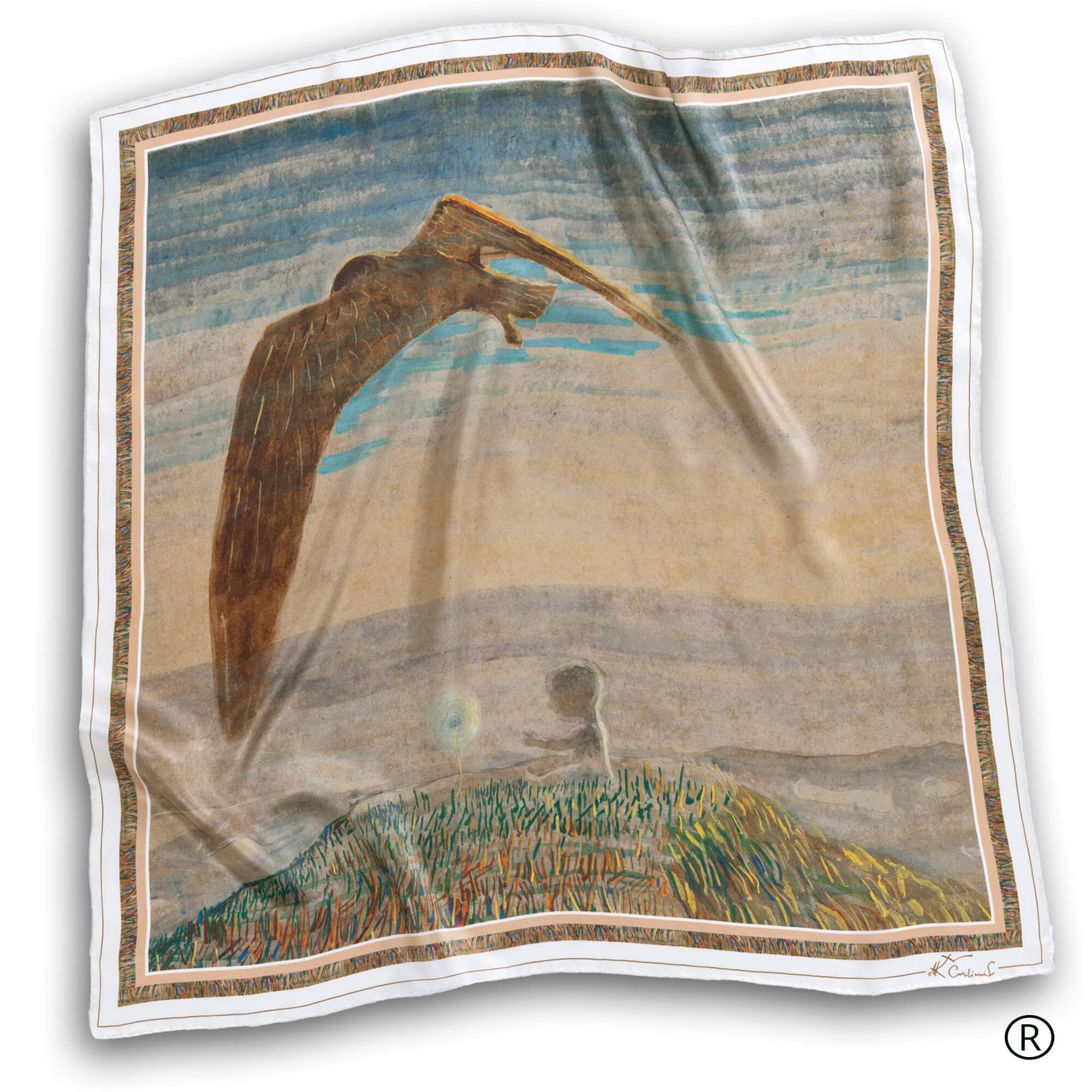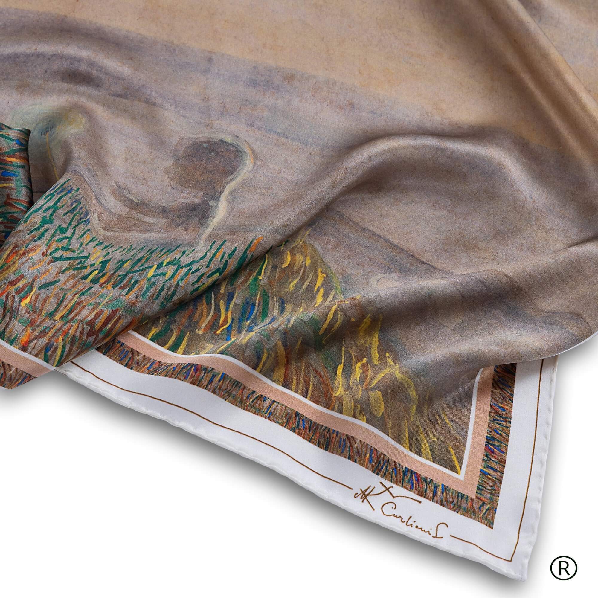 Originalaus, registruoto dizaino natūralaus šilko skarelė su M. K. Čiurlionio paveikslo „Pasaka. Karalaitės kelionė “ atvaizdu