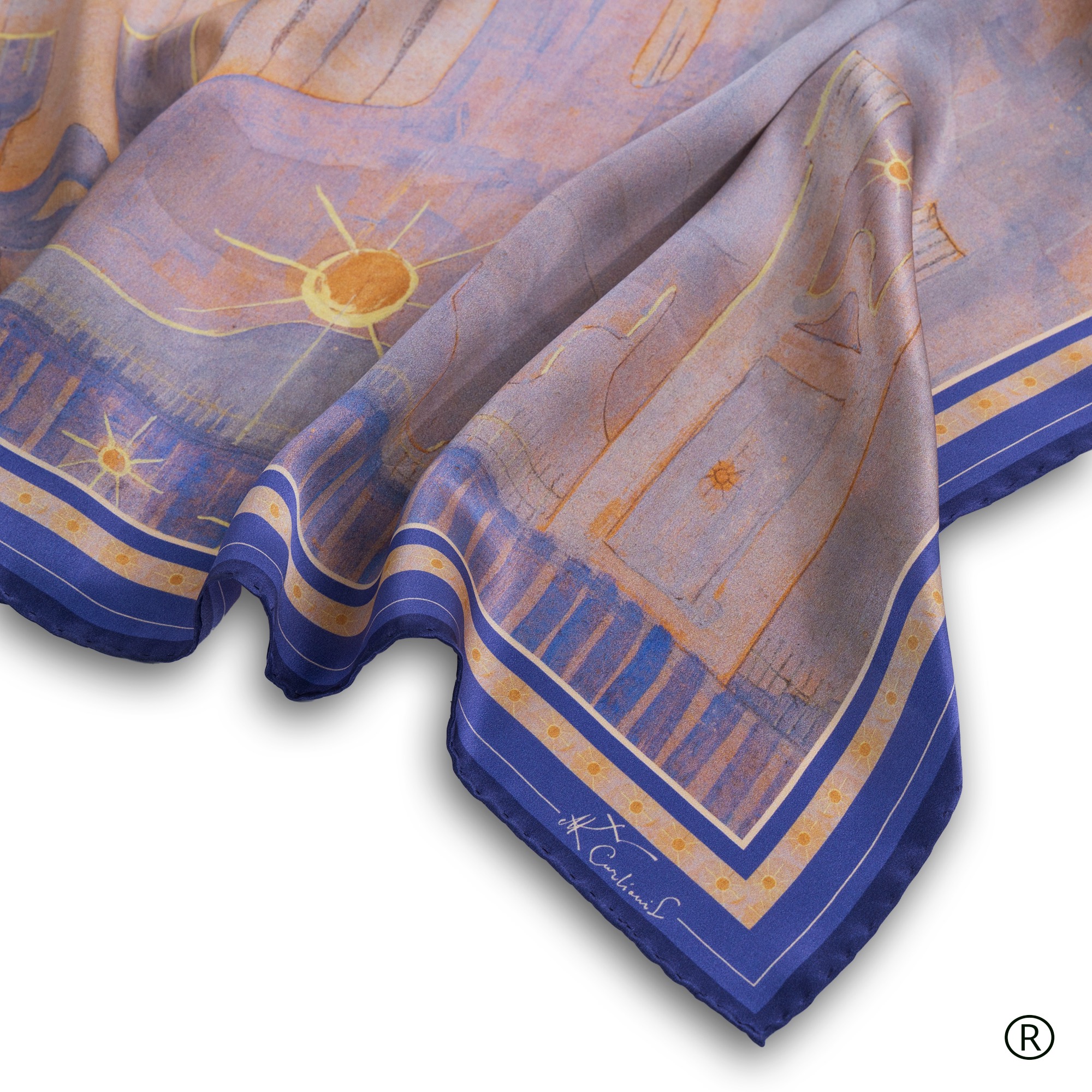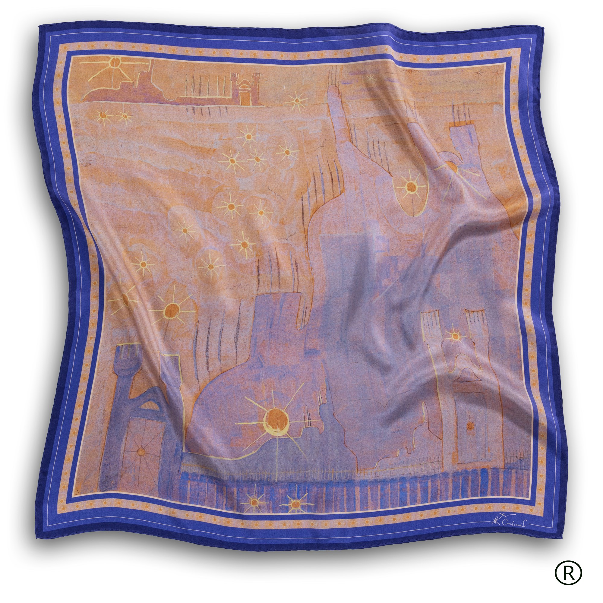 Originalaus, registruoto dizaino natūralaus šilko skarelė su M. K. Čiurlionio paveikslo „Sonata I (Saulės sonata). Allegro” atvaizdu.
