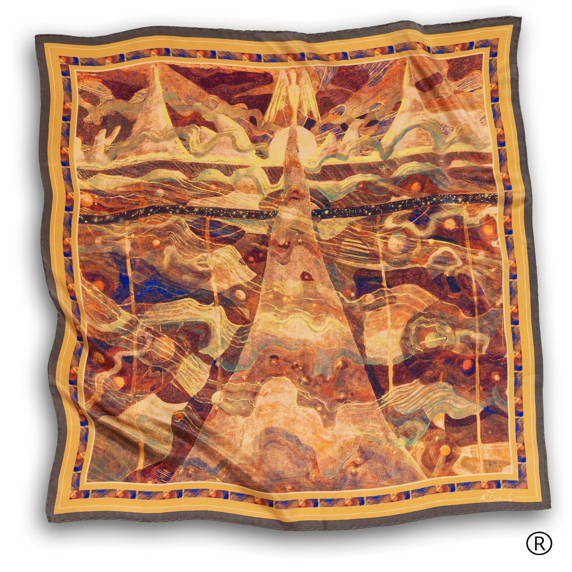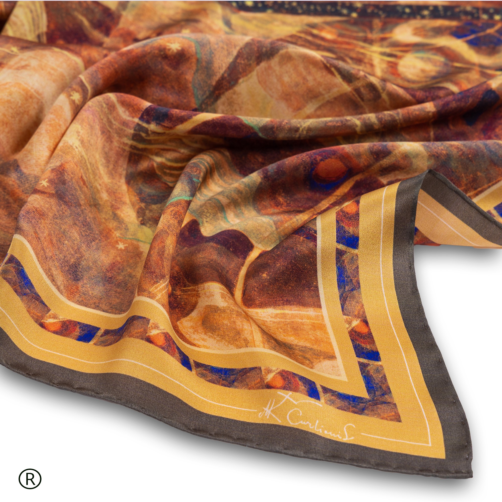 Originalaus, registruoto dizaino natūralaus šilko skarelė su M. K. Čiurlionio paveikslo „ALLEGRO”, iš ciklo SONATA VI (Žvaigždžių sonata) atvaizdu.