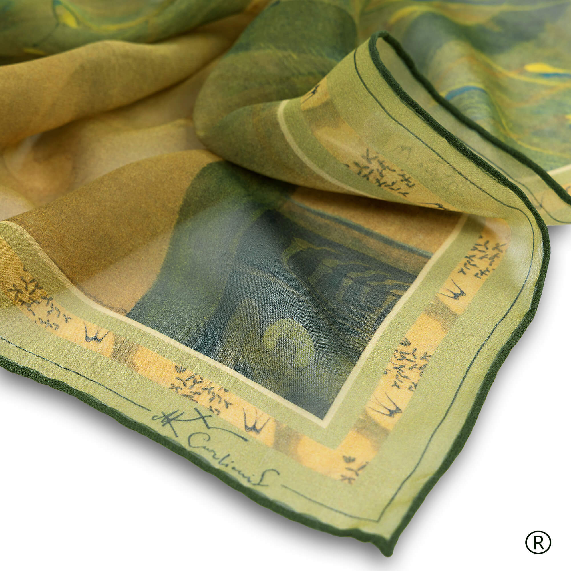Originalaus, registruoto dizaino natūralaus šilko žoržeto (georgette) skarelė su M. K. Čiurlionio paveikslo „Vasaros sonata. Sherzo” atvaizdu.